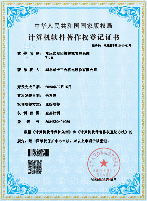 20240318液壓式啟閉機智能管理系統--計算機軟件著作權登記證書